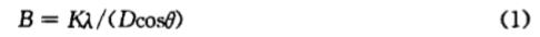 薄膜晶粒的大小是影響薄膜衍射峰寬的因素之一。晶粒細小的薄膜的XRD譜線呈寬化。當晶粒小于10-5cm時,由于晶體結構完整性的下降和無序度的增加,衍射峰變寬,衍射角也發生2θ~θ的轉變。而且晶粒越小,寬化越明顯,直至轉變為漫散峰。試驗薄膜晶粒尺寸由Scherrer公式計算: