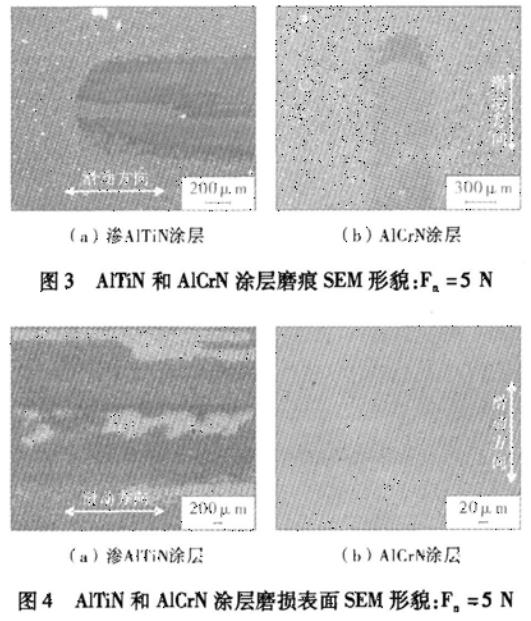 對比法向載荷為5N時的兩種涂層磨痕輪廓可知,AITiN涂層的磨損深度最大值約為1.2um,明顯高于AICrN涂層的0.6um(見圖2(a))。此外,AlTiN涂層磨痕中心有隆起狀的磨屑堆積,而AlCrN涂層磨痕內部的磨損表面非常平整,無明顯起伏(見圖2)。當法向載荷增加為10N時,AlTiN涂層磨損明顯加劇,磨損深度最大值約2.8um,大于涂層的厚度。表明涂層已磨穿;而AlCrN涂層的磨損程度較法向載荷為5N時無明顯加重,法向載荷的增大只使得涂層的磨損深度及寬度略微增大,AlCrN涂層的耐磨性明顯優于AlTiN涂層。
