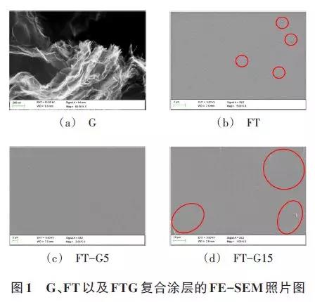 通過FE-SEM觀察石墨烯的微觀形貌特征,結(jié)果如圖1所示。由圖1可以看出,石墨烯呈薄紗卷曲形狀,這是由于石墨烯表面能較高,極易因表面電荷不平衡而失穩(wěn),破壞石墨烯本身的平面結(jié)構(gòu),因此呈現(xiàn)出褶皺形貌特征;FT涂層表面有微型大量孔洞及褶皺,而添加適量石墨烯后,涂層表面平整光滑,無(wú)明顯缺陷,當(dāng)石墨烯含量達(dá)到0.15wt%時(shí),涂層表面出現(xiàn)較多縫隙、裂紋等缺陷,且有團(tuán)聚塊出現(xiàn)。