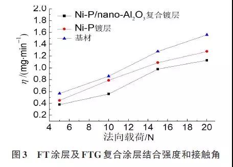 復(fù)合涂層的結(jié)合強(qiáng)度和接觸角測(cè)試結(jié)果如圖3所示,隨著石墨烯的添加,結(jié)合強(qiáng)度和接觸角均表現(xiàn)為先增大后減小的趨勢(shì)。