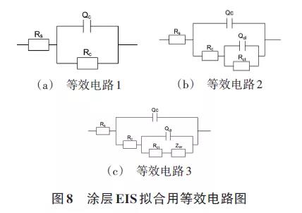 采用圖8所示的等效電路作為物理模型對(duì)EIS圖進(jìn)行擬合分析,可以得到溶液電阻Rs、涂層電容Qc、涂層電阻Rc以及涂層下金屬腐蝕反應(yīng)的電荷轉(zhuǎn)移電阻Rct、雙電層電容Qdl等信息,另外當(dāng)出現(xiàn)擴(kuò)散尾時(shí)引入Warburg阻抗Zw來(lái)擬合。擬合發(fā)現(xiàn),對(duì)于FT涂層和FT-G1復(fù)合涂層,在6~168h階段、288~720h分別用圖8(b)和圖8(c)中的等效電路進(jìn)行較好的擬合,而FT-G5涂層EIS圖在6~288h和360~720h階段分別用圖8(a)和圖8(b)進(jìn)行擬合,F(xiàn)T-G15用圖8(c)所示電路擬合較好。由于涂層電阻(Rc)和電荷轉(zhuǎn)移電阻(Rct)可用來(lái)表示涂層對(duì)金屬基體的防護(hù)性能,因此通過分析Rc和Rct來(lái)研究涂層的防腐蝕性能。