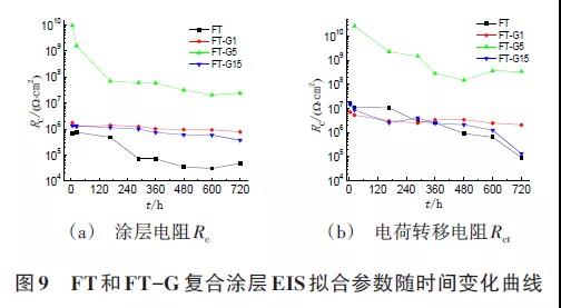 圖9為擬合所得的Rc和Rct,可以看到,F(xiàn)T-G5涂層的Rc和Rct遠(yuǎn)高于其他涂層,表明石墨烯含量為0.05wt%的復(fù)合涂層具有最佳的腐蝕防護(hù)性能。值得注意的是,F(xiàn)T-G5涂層的Rc和Rct在初期快速下降,隨后分別保持在107Ω·cm2和108Ω·cm2以上,這可能是由于涂層阻抗較高時(shí),腐蝕介質(zhì)在涂層中的滲透對(duì)涂層電阻的影響較明顯,導(dǎo)致涂層電阻和電荷轉(zhuǎn)移電阻的急劇下降;其他涂層的Rc和Rct變化相對(duì)較小,但在360h后Rc均低于106Ω·cm2,Rct比FT-G5涂層低2個(gè)數(shù)量級(jí)??梢悦黠@地看到,純氟碳涂層的Rc和Rct在長(zhǎng)時(shí)間浸泡后均低于復(fù)合涂層,表明添加石墨烯有利于提高涂層的防腐性能,其中含0.05wt%石墨烯的復(fù)合涂層腐蝕防護(hù)作用最好。
