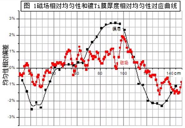 圖1中,磁場(chǎng)的均勻性計(jì)算方法為(Bi—Ba)/Ba,其中Bi為實(shí)際測(cè)量的靶的長(zhǎng)度方向各點(diǎn)沿靶的寬度方向的磁場(chǎng),Ba為實(shí)際測(cè)量的所有Bi平均;薄膜的厚度相對(duì)偏差由公式(kdi-kda)/kda計(jì)算,其中k為膜層對(duì)波長(zhǎng)550nm的光的吸收系數(shù),di分別為不同點(diǎn)的厚度,da為所有di的平均厚度。kdi由公式T=T0(1-R)exp(-kdi)計(jì)算,其中,T為樣品對(duì)波長(zhǎng)550nm的光的透光率,T0為PET聚酯基材對(duì)波長(zhǎng)550nm的光的透光率,R為鈦薄膜和基材接觸界面對(duì)波長(zhǎng)550nm的光的反射率,可以認(rèn)為和鈦薄膜和空氣界面的反射率相等。T、T0、R由島津的UV-3600分光光度計(jì)測(cè)量。