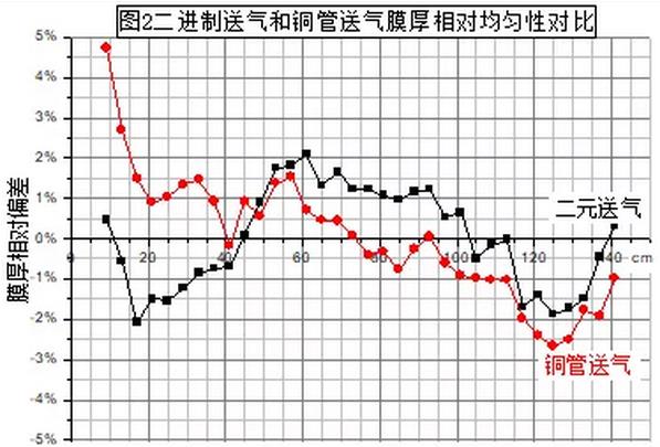 圖2是均勻抽氣不同送氣方式下膜厚的變化情況: