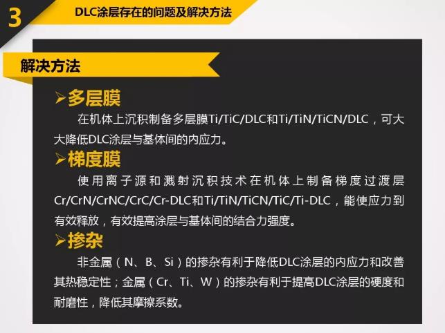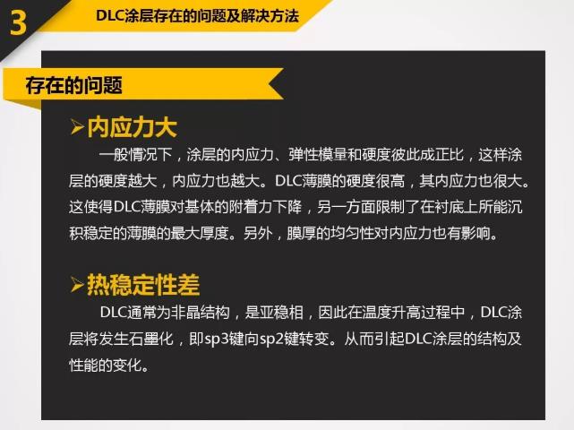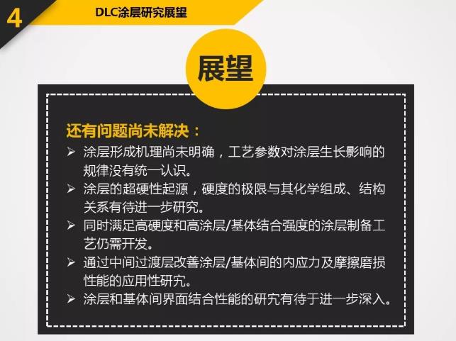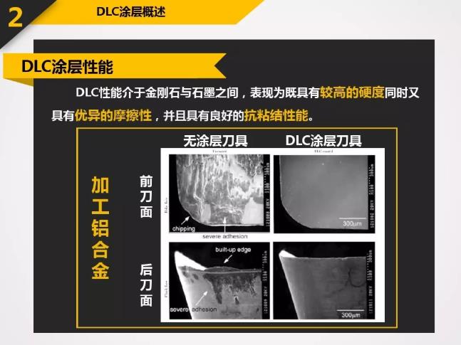 DLC具有很多優(yōu)良的特性:高硬度-60GPa或Hv6000以上;低摩擦系數(shù)-0.06;極好的膜層致密性;良好的化學(xué)穩(wěn)定性以及良好的光學(xué)性能等。應(yīng)用于刀具上的DLC涂層所表現(xiàn)出的特殊性能遠(yuǎn)超過其它硬質(zhì)涂層。涂以DLC的刀具主要應(yīng)用包括:石墨切削,各種有色金屬(如鋁合金,銅合金等)切削,非金屬硬質(zhì)材料(如亞克力,玻璃纖維,PCB材料)切削等。