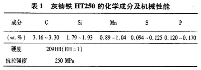 試驗機床為ETC3650h數控機床,機床主軸功率15kW,最高轉速4000rpm。裝夾刀桿編號為CRGN525M1207,刀片安裝角度為:前角γ0=-6°,后角α0=6°,主偏角Kr=45°。刀具失效標準為后刀面磨損量VB=0.3mm。切削用量為:Vc=300m/min,f=0.1mm/r,ap=0.5mm。工件材料為HT250灰口鑄鐵,工件尺寸為Φ100mm×150mm,該鑄鐵的化學成分與機械性能如表1所示。