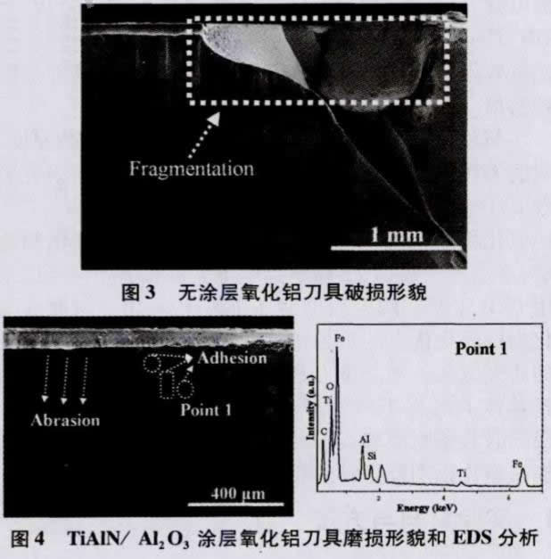 (2)高速干切削灰鑄鐵試驗中發現,無涂層氧化鋁刀具不適合切削灰鑄鐵,加工時會發生崩刃破損;而TiAlN/Al2O3涂層氧化鋁刀具主要發生磨粒磨損和少量的粘結磨損,刀具使用壽命至少是前者的兩倍。