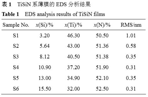 表 1 所列為 6 個樣品(S1~S6)的 EDS 分析結果。由表1可知,薄膜中N含量(摩爾分數)保持基本不變,隨著Si含量的增大,Ti含量逐漸下降。通過改變離子束濺射的束流和磁過濾線圈電流使薄膜中 Si 含量具有較強的可控性,所制備的 TiSiN 薄膜中 Si 含量在 3.2%~15.5%的范圍。