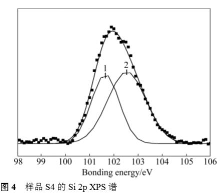 從 XRD 結果分析得到的信息在 XPS 結果中得到進一步的證明。圖4所示為薄膜樣品S4中的Si 2p XPS 譜。經過擬合分峰,從圖 4 可以看出,樣品 S4(Si 含量 10.9%)中的 Si 2p 峰由兩個峰合成,1 號峰位于101.7 eV附近,與Si3N4 中的Si 2p峰位一致,2號峰位于102.6eV附近,應該對應于Ti(Si)N固溶體中Si 2p的結合能,由于它既不對應于更高鍵能的 SiO2(103.1 eV)中的Si,也不對應于較低鍵能的TiSi(98.8 eV)中的 Si,且與所報道的非平衡狀態Ti(Si)N固溶體中 Si 2p 峰的峰位相吻合。結合 XRD 結果可知,薄膜中晶相是以 Ti(Si)N 固溶體的形式存在,當固溶體中 Si 飽和后,又有非晶態 Si3N4 相出現。由此可見,即使利用了磁過濾陰極弧這種離化率和離子能量較高的方法,在不對基底加熱、加負偏壓的情況下,仍然不利于TiN和Si3N4 的兩相分離。