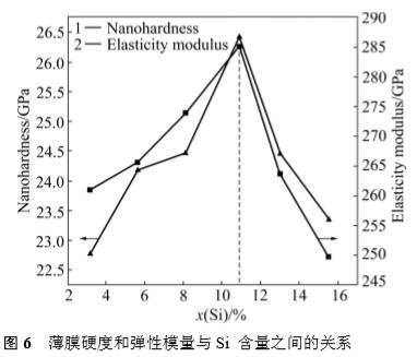 3) 薄膜硬度在22~26 GPa之間,基于固溶體增強效應,Si 含量(摩爾分數)為 10.9%時,薄膜的硬度和彈性模量均達到最大值。