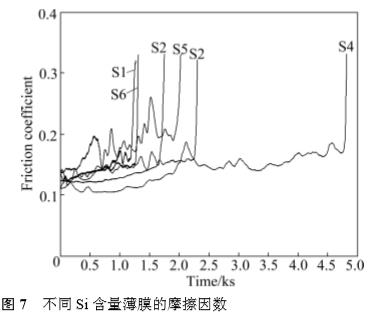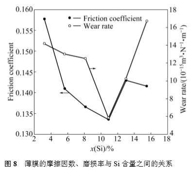 4) 以 Si3N4 為對偶,薄膜的摩擦因數均維持在 0.13~0.17之間;在Si含量為10.9%時,薄膜的摩擦因數和磨損率達到最低值。