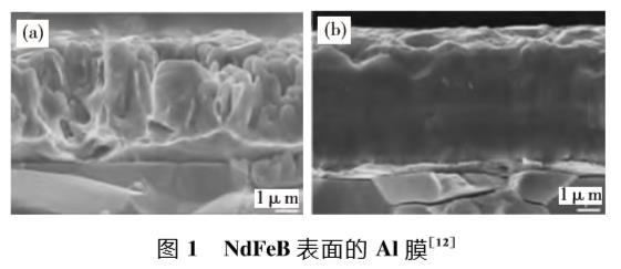 MaoSD等采用直流磁控濺射技術(shù)在NdFeB上沉積Al膜,得到呈柱狀晶結(jié)構(gòu)的Al薄膜,如圖1(a)所示。研究表明,磁控濺射鍍鋁提高了磁體的耐腐蝕性能;由于鍍鋁層柱狀晶間的微孔貫穿薄膜,因此帶有Al防護(hù)鍍層的NdFeB材料腐蝕時(shí),腐蝕液會(huì)通過這些微孔到達(dá)基體。MaoSD等又采用了離子束輔助磁控濺射(Ion-beam-assisteddeposition,IBAD)的方法在NdFeB表面制備了Al膜,見圖1(b),可以看出柱狀晶結(jié)構(gòu)消失,膜層更加均勻和致密,結(jié)果表明,經(jīng)240h中性鹽霧試驗(yàn)后,磁控濺射的純Al薄膜表面出現(xiàn)大面積的紅銹,但I(xiàn)BAD制備的Al膜表面只有少量的紅銹,其耐蝕性能明顯提高,這主要是由于IBAD-Al膜層中存在更多致密的氧化膜。MaoSD等也采用等離子體輔助磁控濺射法制備了Al/Al2O3多層膜。