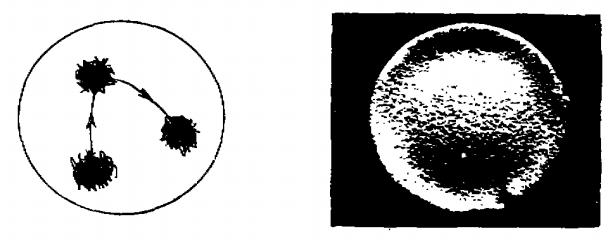 圖2是在靶面附近加一非軸對稱磁場且磁力線平行于靶面的情況下電弧放電的弧斑形貌,這種情況下弧斑亦為堆團(tuán)狀,其運動是沿一個方向(與磁場方向有關(guān)),最后停留于靶面外沿一點至到滅弧。