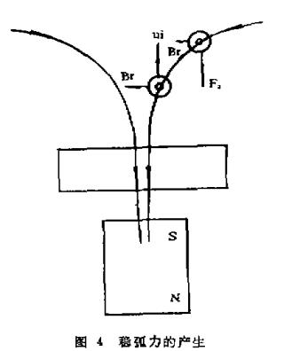 當(dāng)靶面附近加一平行靶面的磁場時(參見圖2)在磁場作用下帶電粒子只受到一個方向力的作用,導(dǎo)致弧斑沿一個方向運動且迅速停留在靶邊沿一點,最后熄滅。