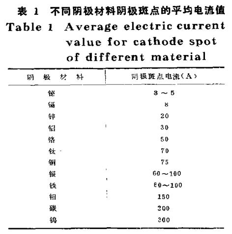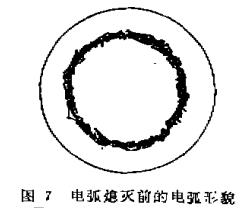 觀察靶陰極電弧的燃燒情況,每當(dāng)電弧熄滅前,總是發(fā)現(xiàn)電弧弧斑極為粗糙(參見圖7)。有時甚至出現(xiàn)堆團(tuán)狀弧斑。熄滅后觀察靶面已發(fā)紅,靶表面溫度很高,粗糙弧斑的出現(xiàn),使弧電流較集中于靶面一點,導(dǎo)致了弧斑下靶面斑點電流過于集中,使弧斑下的靶面溫度更高而產(chǎn)生大量的熱電子發(fā)射。靶面局部大量的熱電子發(fā)射的結(jié)果,一方面中和了大量的空間電荷,使陰極表面上的電場成為減速場,甚至導(dǎo)致陰極表面上的電場等于零。另一方面,大量的熱電子發(fā)射對陰極表面產(chǎn)生相當(dāng)大的冷卻作用。