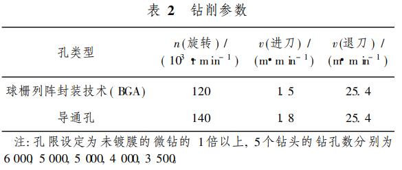 用PHI700型納米掃描俄歇系統分析多層膜成分。用CM200FEG型透射電子顯微鏡(TEM)及JSM5910型掃描電鏡(SEM)觀察多層膜的表面形貌。膜層的顯微硬度用MH-5D型顯微硬度計測量,采用維氏壓痕,載荷0.25N,保荷15s。采用HH-3000型薄膜結合強度劃痕試驗儀測量膜/基結合力,最大載荷100N,加載速度100N/min,劃痕速度4mm/min。采用MS-T3000型球盤摩擦磨損試驗儀在大氣環境下測試膜層摩擦性能,載荷3N,旋轉半徑20mm,轉速400r/min,測試時間120min。5個直徑0.3mm的鉆頭沉積多層薄膜后,鉆削厚1.5mm的4層覆銅的玻璃纖維增強層復合板,收集斷針數據,進行自動光學檢查(AOI)孔位量測、切片,測試鉆頭斷針、批鋒、塞孔、孔位精度、孔粗,鉆削參數見表2。