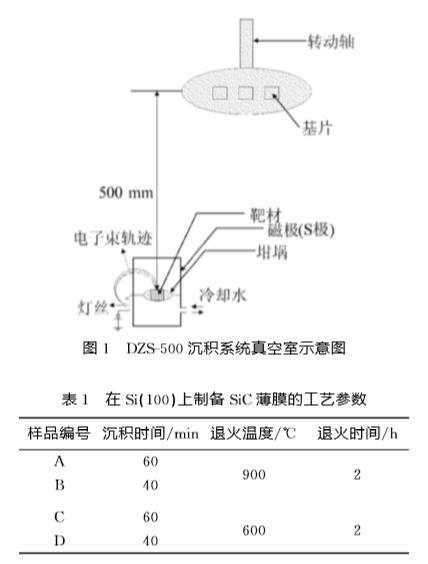 實驗采用中國科學(xué)院沈陽科學(xué)儀器公司研制的DZS-500電子束沉積系統(tǒng)。選擇單晶Si(100)作為基片,并將其切割成10mm×5mm的方片。對基片分別用丙酮、乙醇和去離子水超聲清洗15min。靶材采用純度為98%的SiC壓片。坩堝和基片之間的垂直距離為500mm。在EB-PVD蒸發(fā)沉積過程中,E型槍所產(chǎn)生的高能電子束流將SiC靶材熔化蒸發(fā),使其沉積到基板的Si片上形成薄膜,如圖1所示。沉積過程中真空度為6.7×10-3Pa,設(shè)定沉積速率為0.6nm/s,薄膜沉積時間分別為40、60min。電子束流強度30~60mA。沉積結(jié)束后繼續(xù)保持高真空狀態(tài),待自然冷卻后,打開真空室取出試樣。對制備態(tài)試樣在2.0×10-2Pa真空中進(jìn)行退火處理,退火溫度分別為600、900℃,退火時間均為2h,SiC薄膜制備工藝參數(shù)見表1所列。