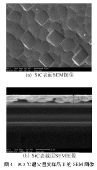 (3)SiC薄膜的SEM形貌分析。圖4所示為厚度為1.5μm的SiC薄膜樣品B經(jīng)900℃退火2h后的SEM圖像。圖4表明,SiC薄膜晶粒的晶界清晰,結(jié)晶狀態(tài)良好,薄膜表面平整且致密。
