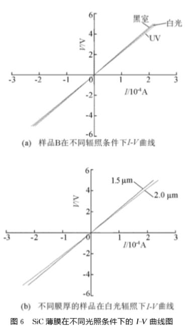 ③在SiC薄膜上施加相同的電壓時,紫外光照射下電流最大,白光次之,黑室電流最小,在相同輻照條件下,薄膜越厚,電流越大。
