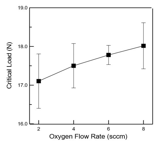 3、隨著氧氣流量的增加鍍層附著性增加,系因內應力的影響。而隨著厚度的增加,受到之剪力越大,造成鍍層附著性降低。