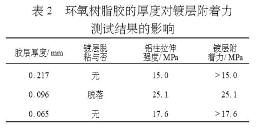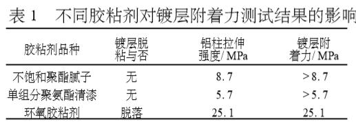 3.1 膠粘劑品種膠粘劑品種的選擇對(duì)于鍍層附著力的測(cè)試結(jié)果有重要的影響。膠粘劑選擇不當(dāng),鍍層根本不發(fā)生脫落,如選用的不飽和聚酯膩?zhàn)雍蛦谓M分聚氨酯清漆,拉伸時(shí)破壞均表現(xiàn)為膠層脫落,而鍍層不出現(xiàn)脫落現(xiàn)象。這表明鍍層的附著力遠(yuǎn)大于對(duì)粘鋁柱的粘接強(qiáng)度。環(huán)氧樹(shù)脂具有優(yōu)異的粘接性能,低分子聚酰胺固化的環(huán)氧具有較好的韌性,因此選擇651低分子聚酰胺固化E-51環(huán)氧膠粘劑體系。使用這種環(huán)氧膠粘劑對(duì)鍍層進(jìn)行粘接,能夠使對(duì)粘鋁柱拉伸時(shí)鍍層脫落。這表明膠粘劑的粘接強(qiáng)度與鍍層的附著力基本相等。分別用不飽和聚酯膩?zhàn)印谓M分聚氨酯清漆和環(huán)氧膠粘劑粘接鍍層并測(cè)附著力,結(jié)果見(jiàn)表1。
