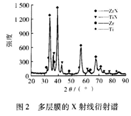 圖2為Ti/TiN/Zr/ZrN多層膜的x射線衍射譜。由圖2可知,多層膜中主要存在ZrN和TiN2個(gè)相,含少量的zr和Ti相,其中ZrN與TiN均為面心立方結(jié)構(gòu)。