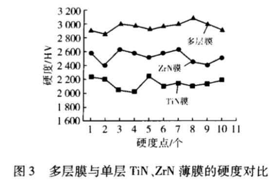圖3是Ti/TiN/Zr/ZrN多層膜與TiN、ZrN單層薄膜的顯微硬度。由圖3可知,單層TiN薄膜的顯微硬度在2000~2300HV之間;單層ZrN薄膜的顯微硬度在2400~2700HV之間;多層膜的硬度在2800-3100HV之間,高于單層TiN和ZrN薄膜的硬度。