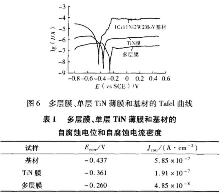 圖6為多層膜、單層TiN薄膜和1Crl1Ni2W2MoV基材在3.5%NaC1溶液中的Tafel曲線。表1為圖6Tafel曲線經(jīng)電化學(xué)工作站軟件擬合得到的自腐蝕電位和自腐蝕電流密度。