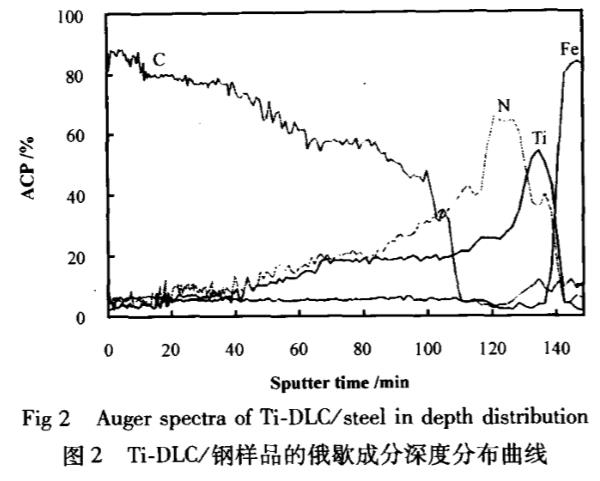 圖1所示為摻鈦類金剛石(Ti-DLC)薄膜的XPS譜圖可以看出:薄膜中除碳以外,還存在鈦(含量為6.8at%),Ti2p的特征峰位于455.1eV處,大于Ti值453.7eV,小于TiO,值458.7eV,可以判斷在非晶類金剛石薄膜中含有微晶TiC相,圖2所示為在鋼基體上所制備的Ti-DLC1(為了避免基體中Ti的干擾,采用鋼基體)樣品成分沿深度分布的曲線可見,膜層依次為Steel/Ti/TiN/TiCN/TiC/Ti-DLC,其中小于5at%的信號為儀器基底噪聲所致,同時,所含少量N可能是由于本底真空度(5×10-3Pa)不高而殘存一定空氣所致.在TC4基體上所制備的薄膜厚度約為2.81um,膜層的硬度HV0.1.25為6.51Pa(HV0.01.25=19.8GPa),膜/基結合力約44N。