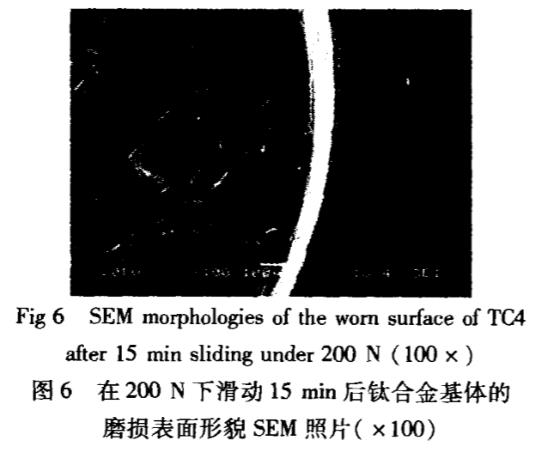 圖6所示為TC4基底在漸進加載(漸進方式如圖5上半部)至200N保載滑行15min后(不能繼續試驗)的磨損表面局部形貌SEM照片可見:其磨痕表面粘著痕跡明顯,主要為粘著磨損,并伴有少量磨粒磨損且磨痕較深,這主要是由于在加載初期,TC4表面氧化生成脆性較大的氧化鈦膜,在摩擦過程中出現疲勞裂紋,裂紋隨摩擦的繼續而擴張,隨著顆粒剝落形成磨粒而導致磨粒磨損¨.加載至200N并保載滑行15min后,由于基體較軟,承載能力不足而與偶件粘著,由于以粘著磨損為主,且伴有少量的磨粒磨損,故其的磨損率和摩擦系數較高。