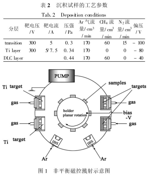 類金剛石(DLC)膜是近年研究較多的薄膜材料之一,它具有許多與金剛石相似或相近的優良性能,如硬度高、彈性模量高、摩擦系數低等。遺憾的是,沉積DLC膜時,膜與基體之間會產生較大的內應力,影響膜與基體的結合,甚至產生膜脫落現象,嚴重影響了DLC膜的應用。為此,人們企圖通過界面設計,采用其它材料與DLC形成多層化結構或多元化膜層,減少膜的內應力并使之與基體具有良好的結合力,從而提高膜層的耐磨性。如金屬/DLC多層膜,它們的內應力比單一的金屬層或DLC層小,硬度卻介于金屬和DLC之間,而有關碳化物/DLC多層膜的研究不多,文獻采用過濾式陰極電弧法制備出DLC/TiCx,和DLC/WCx多層膜,這兩種膜的摩擦性能都較單一膜的性能好,類似的研究還有DLC/TiB2多層膜,其硬度和耐磨性與碳的含量有關。本文采用非平衡磁控濺射和離子源復合沉積的方法,以高純Ti為靶材,用甲烷氣體作碳源制備了TiC/DLC多層膜,通過對多層膜的微觀結構及成分分布的分析,找出制備TiC/DLC多層膜的工藝參數,為尋求制備結合強度高、性能優良的多層膜提供實驗依據。