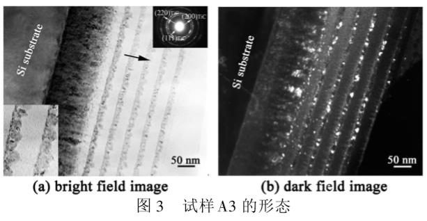 圖3是試樣A2的組織形態,圖中從左至右依次為基體、過渡層和多層膜。靠近基體的過渡層,呈柱狀結構,厚度約為150nm;圖中多層狀結構清晰可見,黑色部分為含Ti元素的分層,明亮部分為非晶碳層,相互交替,厚約200nm,層狀結構中顯示5個周期,與試樣制備工藝預期相符。插入的電子衍射花樣環經標定為面心結構的TiC。圖3(b)是用TiC的(111)衍射矢量所得的暗場像,暗場像中過渡層柱狀組織TiC和層狀結構中分層的TiC相清晰可見,這一觀察結果與XRD的結果一致,說明Ti與C相互結合,Ti層已變成TiC層。另外,從圖3(a)及其放大的插圖中還可以看出,TiC分層沿箭頭方向(即生長方向)的一側(右邊)呈鋸齒形,另一側即非晶碳層DLC沿箭頭方向的一側則比較平直,說明TiC分層薄膜是按島狀模式生長,非晶碳層(DLC)薄膜則按層狀模式生長。