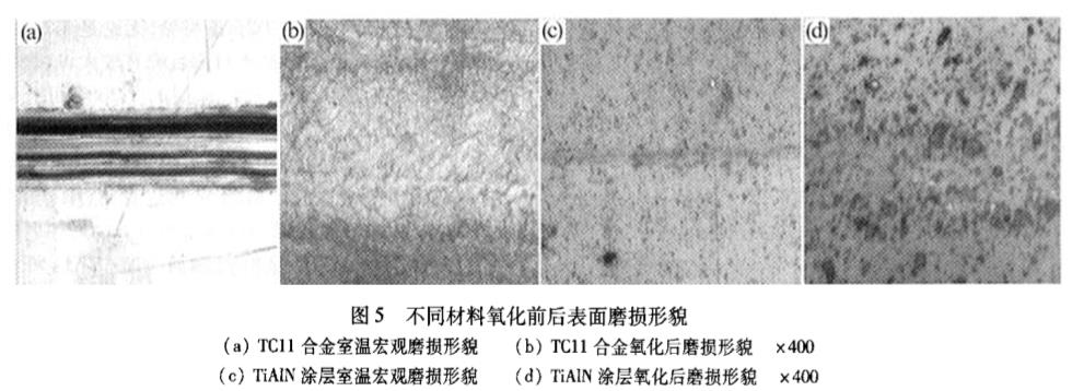 試驗得出TC11鈦合金表面硬度為331HV,而TiAIN膜層的顯微硬度約2000HV,沉積TiAIN涂層后可明顯提高試樣的表面硬度。由圖5可見,在常溫相同刻劃條件下,基體TC11合金的劃痕寬度明顯大于鍍膜樣品的劃痕寬度,在金相顯微鏡下觀察磨痕形貌時,可以看到未鍍膜的TC11合金表面有明顯的深溝狀磨痕,隨著磨損過程的進行,在磨損溝槽內產生較多的金屬屑加劇了合金表面的破損狀況,脫落的磨粒在摩擦過程中被擠壓推移至磨痕的兩側,中間形成較明顯的“犁溝”,兩側形成堆積。而有鍍膜樣品表面只有很淺的條狀的磨痕,表明鍍膜樣品的耐磨性有顯著提高,從阿恰德粘著磨損模型可知表面硬度高的材料具有低的磨損率,TiAIN涂層高硬度應對減摩起著主導作用,并且致密的結構使涂層具有良好的強韌性,減少了磨損過程中產生微裂紋和剝落的可能性。將試驗材料放在650℃空氣中靜態氧化100h后,按照相同的條件研究試樣氧化膜的防護性效果,由圖5可知,TC11氧化膜表面暗色磨內部白亮區域為氧化膜脫落基體暴露所致,鈦合金表面易發生氧化,生成TiO2氧化膜,而TiO2的脆性較大,在接觸作用下易發生脫落。而有鍍膜樣品表面只有輕微的剝落現象,表明氧化后仍具有較好的耐磨性,這與涂層自身的高溫穩定性有直接聯系,TiAIN涂層可以陽擋氧的滲入,長時間氧化時仍具有較好的防氧化和抗磨損效果。