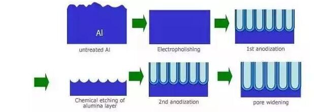陽極氧化:主要是鋁的陽極氧化,是利用電化學原理,在鋁和鋁合金的表面生成一層Al2O3(氧化鋁)膜。這層氧化膜具有防護性、裝飾性、絕緣性、耐磨性等特殊特性。