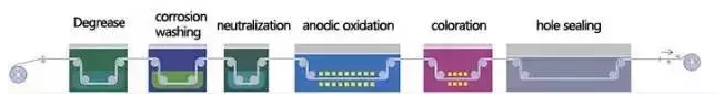 單色、漸變色:拋光/噴砂/拉絲→除油→陽極氧化→中和→染色→封孔→烘干