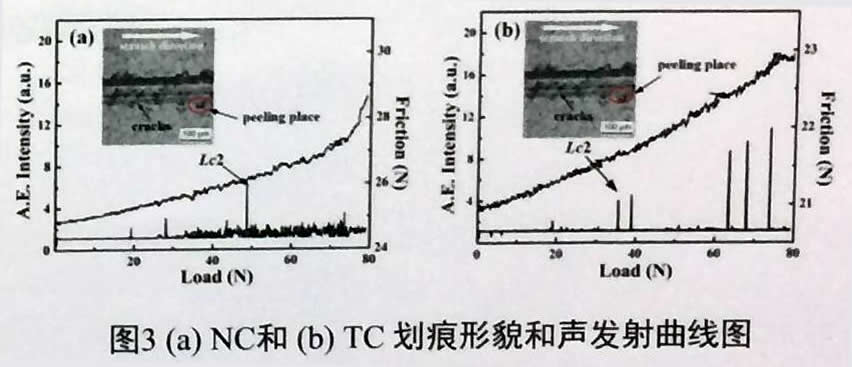 高能離子源技術制備的AlCrN涂層界面臨界失效載荷Lc2=48.7N。傳統離子轟擊技術所制備的涂層Lc2=35.6N圖3-3可明顯看出(a)抵抗涂層剝落的能力優于(b)。在持續加載的過程中可以繼續保持抗力,避免涂層大面積剝落的發生。