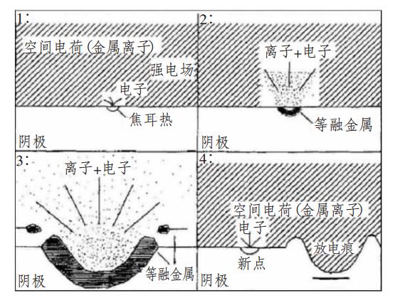 圖2為真空弧光放電示意圖,真空弧光放電理論認為電量的遷移主要借助于場電子發射和正離子電流,這兩種機制同時存在,而且相互制約。在放電過程中,陰極材料大量蒸發,這些蒸發原子產生的正離子在陰極表面附近很短的距離內產生極強的電場,在這樣強的電場作用下,電子足以能直接從金屬的費米能級逸出到真空,產生所謂的“場電子發射”。