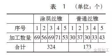 5種涂層絲錐壽命總和是5種普通絲錐壽命總和的327÷173=1.87倍。